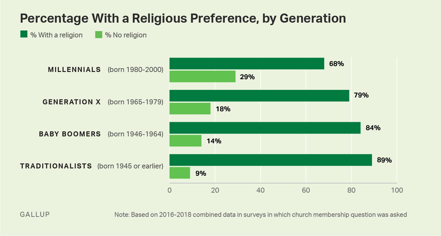 We could take a look at organized religion as an example. It’s no secret that church attendance is in decline, especially among younger generations. Studies everywhere show that pretty much across the board numbers are dropping as indicated in the figures below. Whether it’s the argument that science has disproved the claims made in the Christian belief system, the scandals and hypocrisy that have eroded its credibility, or the dangers posed by fundamentalist religions, there have been a number of reasons to avoid associating with any type of religion. However, as we can see from this graph, a significant portion of the nation belonged to a church just a couple generations ago.