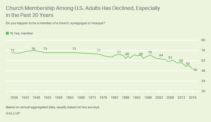 Church membership was incredibly stable up until the late 90’s when it started to sharply decline. And this trend is represented even more starkly in the following chart.