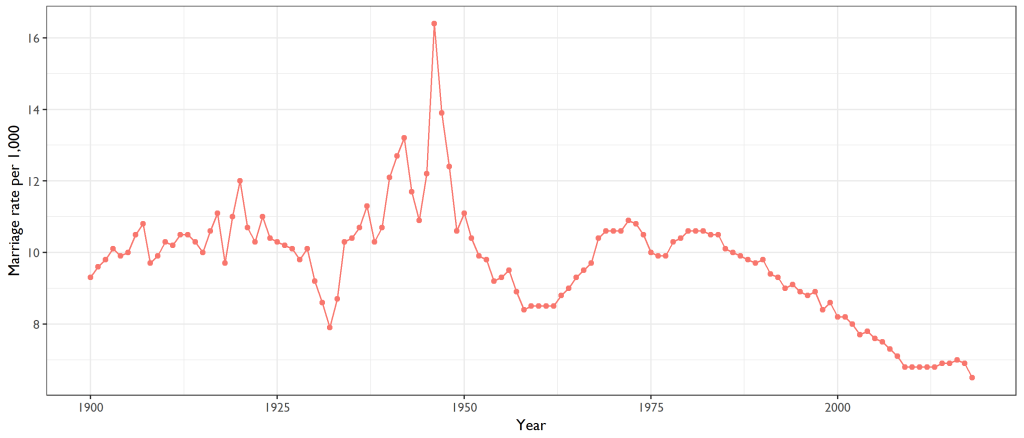 Then one could look at the status of marriages over the past century and the waning influence it has within our society. And with the reduced rate of marriages, we have seen related patterns in the increase of babies born out of wedlock, certainly a condition that does not afford stability to the children – a storyline I would note that one can also find within the plot of The Boys.